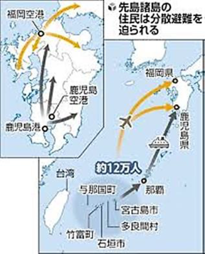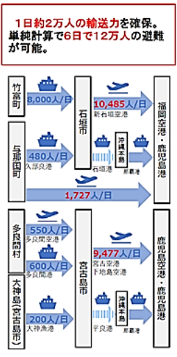 政府(内閣官房)は今年3月27日、有事の際に先島諸島5島の全住民11万人と観光客1万人の計12万人を、6日間のうちに民間のフェリーや飛行機を利用して九州の7県と山口県に避難させる計画を発表した。国民保護法に基づくもので、林官房長官が記者会見に応じた。