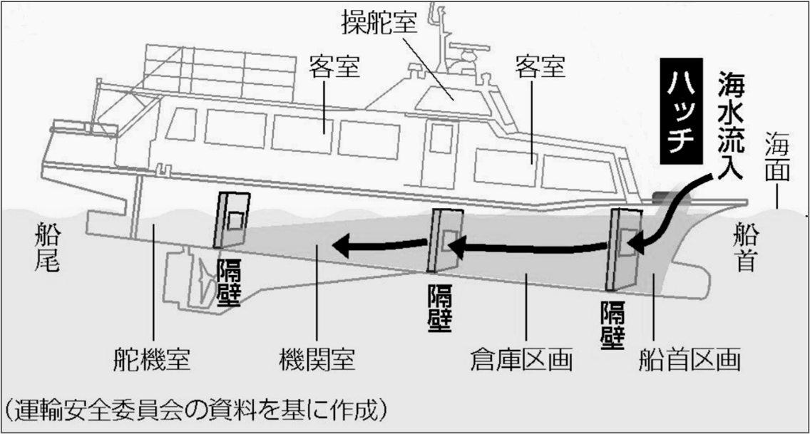 捜査関係者によると、「1菅本部は、事故原因の解明のため、引き揚げた船体の鑑定などを実施。船首甲板のハッチが悪天候による波の影響で開いたことなども確認し、海水が機関室まで入って沈没に至ったと結論づけた。国の運輸安全委員会も昨年9月、ハッチの蓋に経年劣化や緩みがあり、船内に海水が流入したことが直接の原因だとする最終報告書を公表した。社長についても、船の運航に関する知識や経験がなかったなどと指摘した。」と報道されている。